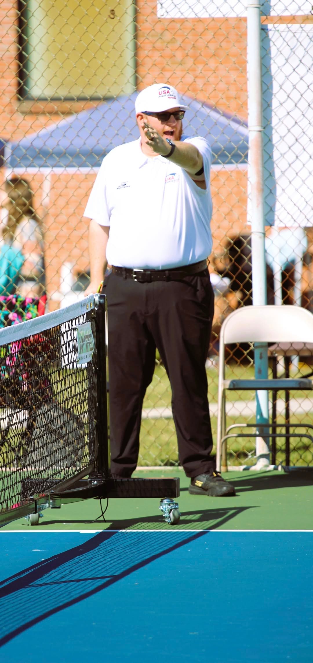 USA Pickleball Credentialed Referee — officiating experience from local amateur events to professional matches including the Music City Open and Life Time singles events